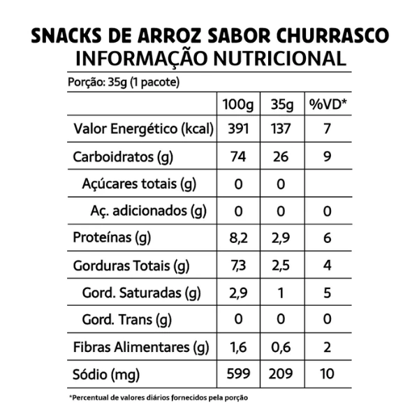 Mix sem glúten (farinha de arroz, lentilha e quinoa), óleo vegetal (palma e soja), extrato de levedura, aromatizante e corante natural urucum. NÃO CONTÉM GLÚTEN. ALÉRGICOS: CONTÉM DERIVADOS DE SOJA.
