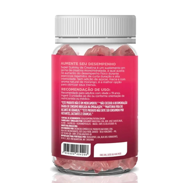 CREATINA MONOHIDRATADA Suplemento que otimiza o desempenho físico, fornecendo a quantidade ideal de nutrientes para o corpo. SABOR MORANGO INGREDIENTES: Creatina monohidratada, concentrado de cenoura e mirtilo, edulcorantes naturais xarope de maltitol e maltitol, estabilizante pectina, acidulante ácido cítrico, aroma natural de morango. NÃO CONTÉM GLÚTEN. INFORMAÇÃO NUTRICIONAL Porção por embalagem: 20 Porção: 10,5g (3 unidades) 10,5g % VD* Valor energético (kcal) 15 1 Carboidratos totais (g) 5,3 2 Açúcares totais (g) 0 Açúcares adicionados (g) 0 0 Polióis (g) 5,3 Creatina monohidratada (mg) 3000 Sódio (mg) 20 1 Não contém quantidade significativa de proteínas, gorduras totais, gorduras saturadas, gorduras trans e fibras. *Percentual de valores diários fornecidos pela porção.