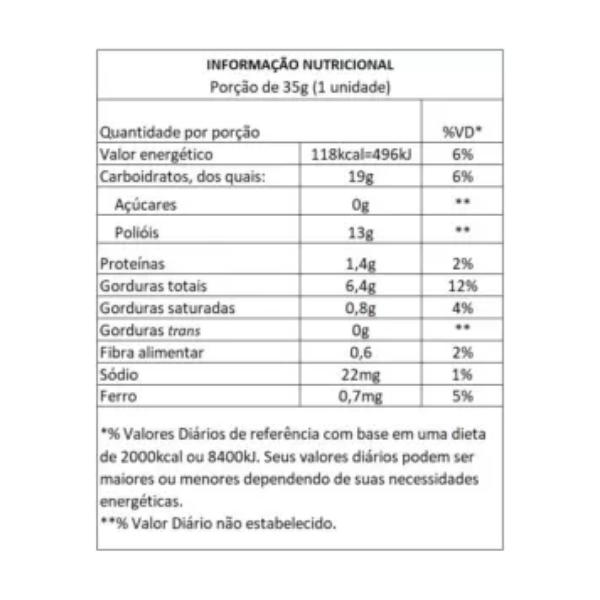 INGREDIENTES: Mix de farinha sem glúten (farinha de arroz e fécula de mandioca), óleo vegetal de girassol, ovo em pó, cacau em pó, castanha-de-caju, sal marinho, farinhas integrais (amaranto e quinoa), farinha de sementes (chia e linhaça), edulcorantes maltitol e glicosídeos de esteviol, espessante goma xantana, aroma idêntico ao natural de leite condensado e conservantes: propionato de cálcio e ácido sórbico.
