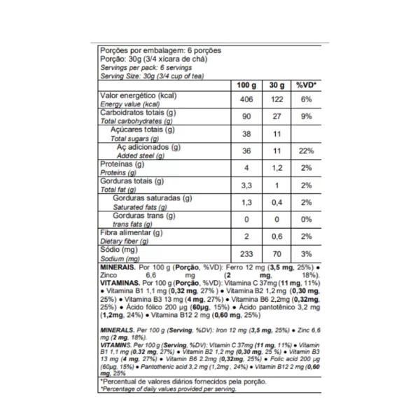 INGREDIENTES: Semolina de milho enriquecida com ferro e ácido fólico, açúcar, cacau em pó, óleo de palma, açúcar invertido, líquor de cacau, sal, complexo vitamínico [ácido ascórbico (vitamina C), niacinamida (niacina), mononitrato de tiamina (vitamina B1), riboflavina (vitamina B2), piridoxina (vitamina B6), cobalamina (vitamina B12), pantotenato de cálcio (ácido pantotênico), ácido fólico], complexo mineral [pirofosfato férrico (ferro), sulfato de zinco (zinco)], corante caramelo IV, aroma sintético idêntico ao natural de baunilha e chocolate.