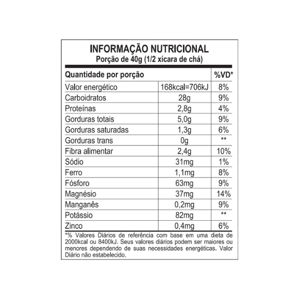 INGREDIENTES: Flocos de milho, linhaça marrom, açúcar mascavo, açúcar invertido, castanha-do-Pará, uva passa, gergelim, quinoa em flocos, óleo de girassol, coco ralado, canela em pó, sal marinho e edulcorante: maltitol.